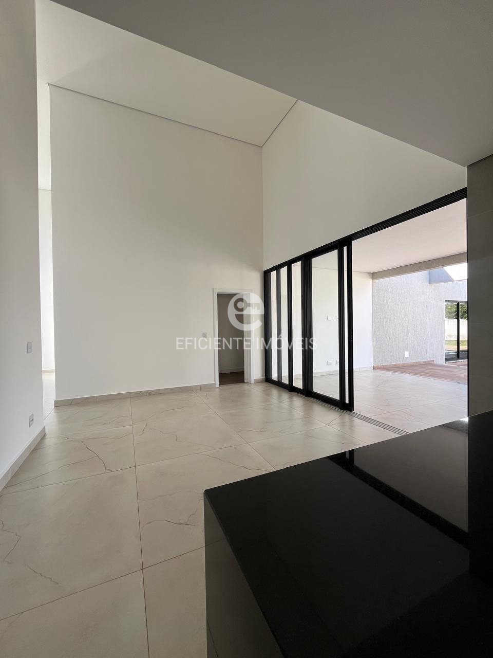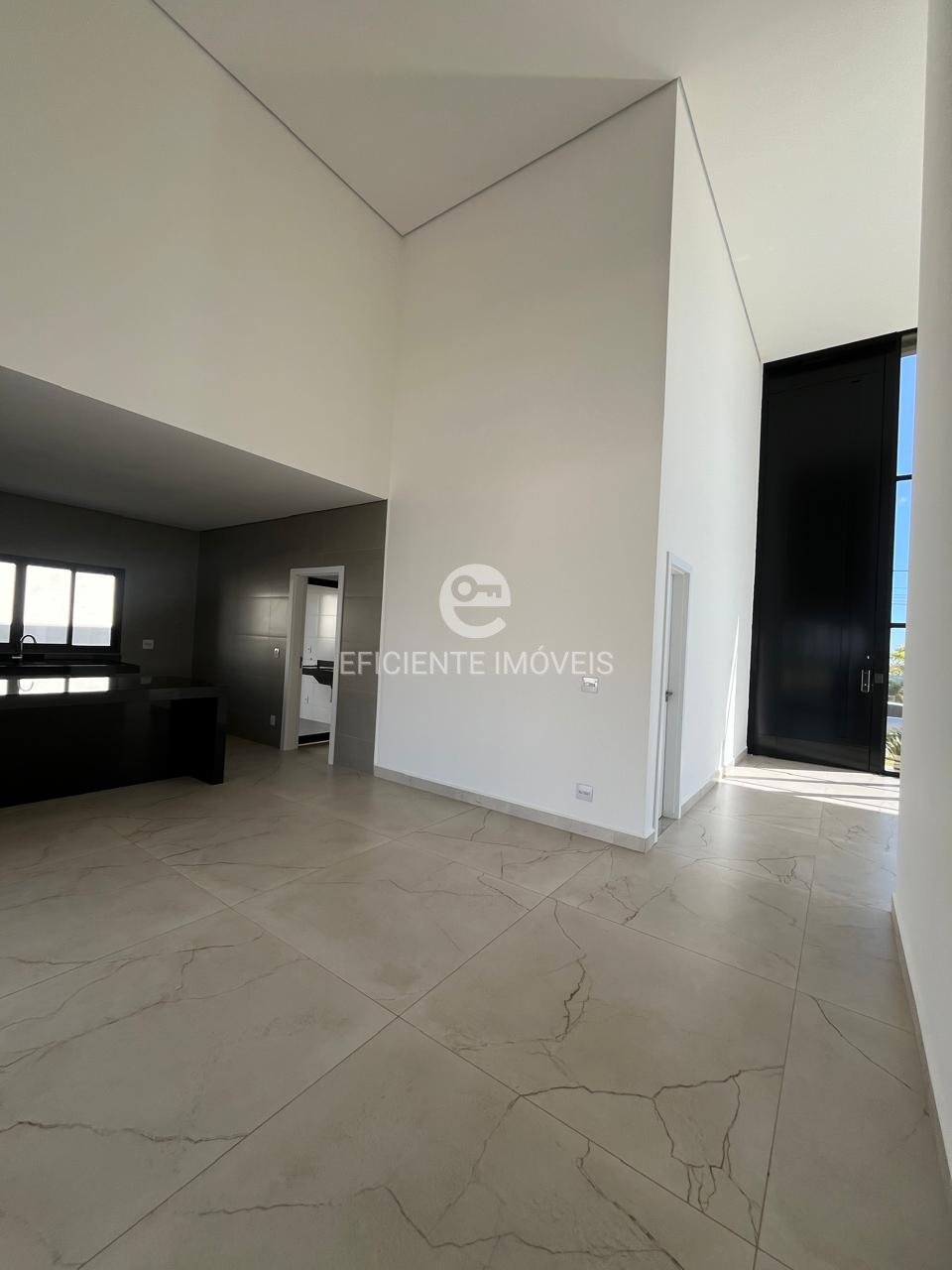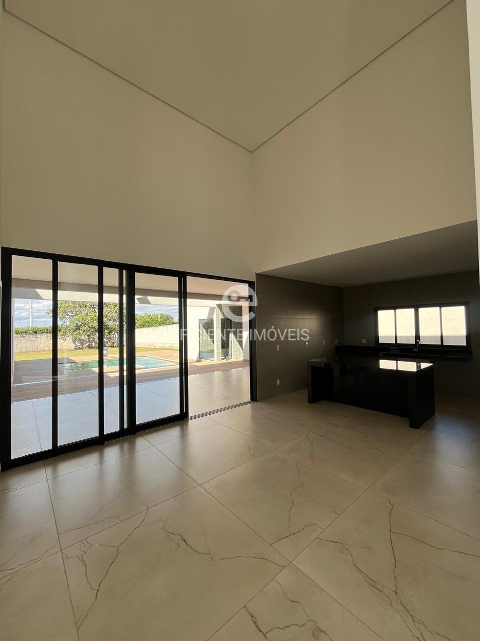 Sala de estar com pé-direito duplo, integrando-se harmoniosamente à cozinha americana e ao espaço gourmet